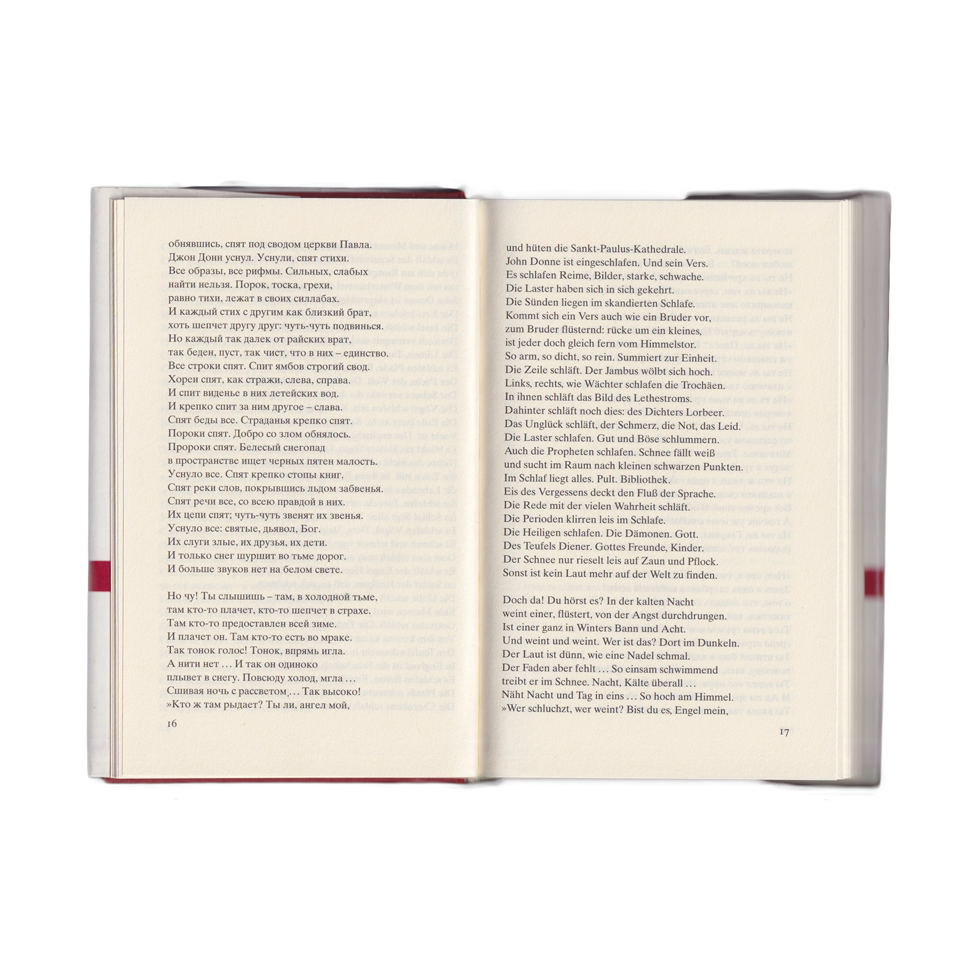 Die Übersetzungen folgen Ralph Dutli, Felix Philpp Ingold, Alexander Kaempfe, Sylvia List, Heinrich Ost, Birgit Veit. Die Übersetzung der Elegie stammt von Alexander Kaempfe und Heinrich Ost. Diese Übersetzung entspricht der Fassung des ersten Titels »Große Elegie an John Donne« auf dem gleichnamigen Album Christian Reiners (es ist die 26-minütige Variante). Diese und eine weitere Interpretation, basierend auf einer alternativen Übersetzung, sind auf der Seite von ECM Records und auf Spotify frei zugänglich.