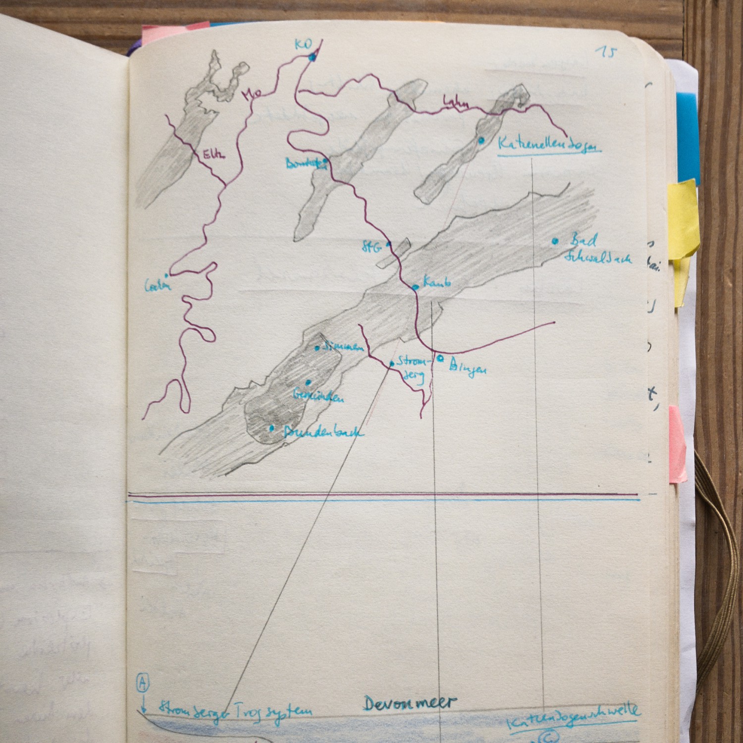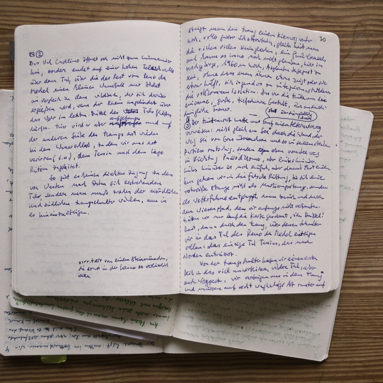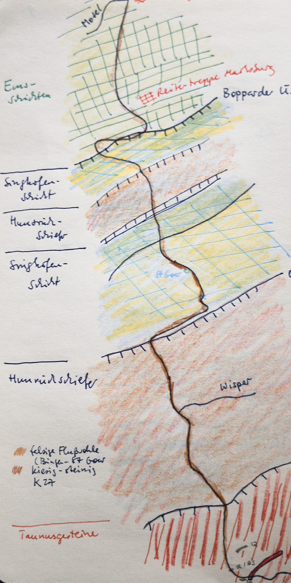 Die Vorbereitung dieser Naturgeschichte umfasst zahllose Wanderungen neben dem Fluss, im Faltboot auf dem Strom, mit dem Rhein. Es ist die Geschichte einer uns umgebenden und durchdringenden Landschaft, ihr Eindringen auf uns und unser Eingreifen in sie. So ist es auch eine Geschichte des blühenden Verfalls, die von den Rheinquellen über die Mündung hinaus bis nach London und Richmond reicht. Die in geologische und zeitliche Tiefen führt und die Dimensionen der Moleskine-Hefte sprengt, die auf allen Wanderungen stets zur Hand sind. Field notes, die die Unmöglichkeit linearen Erzählens enthalten und es so, in anderer, gedruckter Form, ermöglichen. Die das dem Fluss Abgelesene festhalten.
