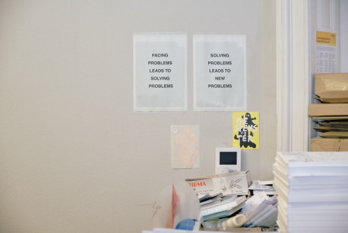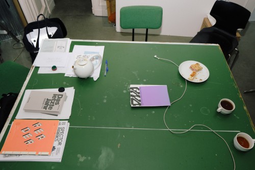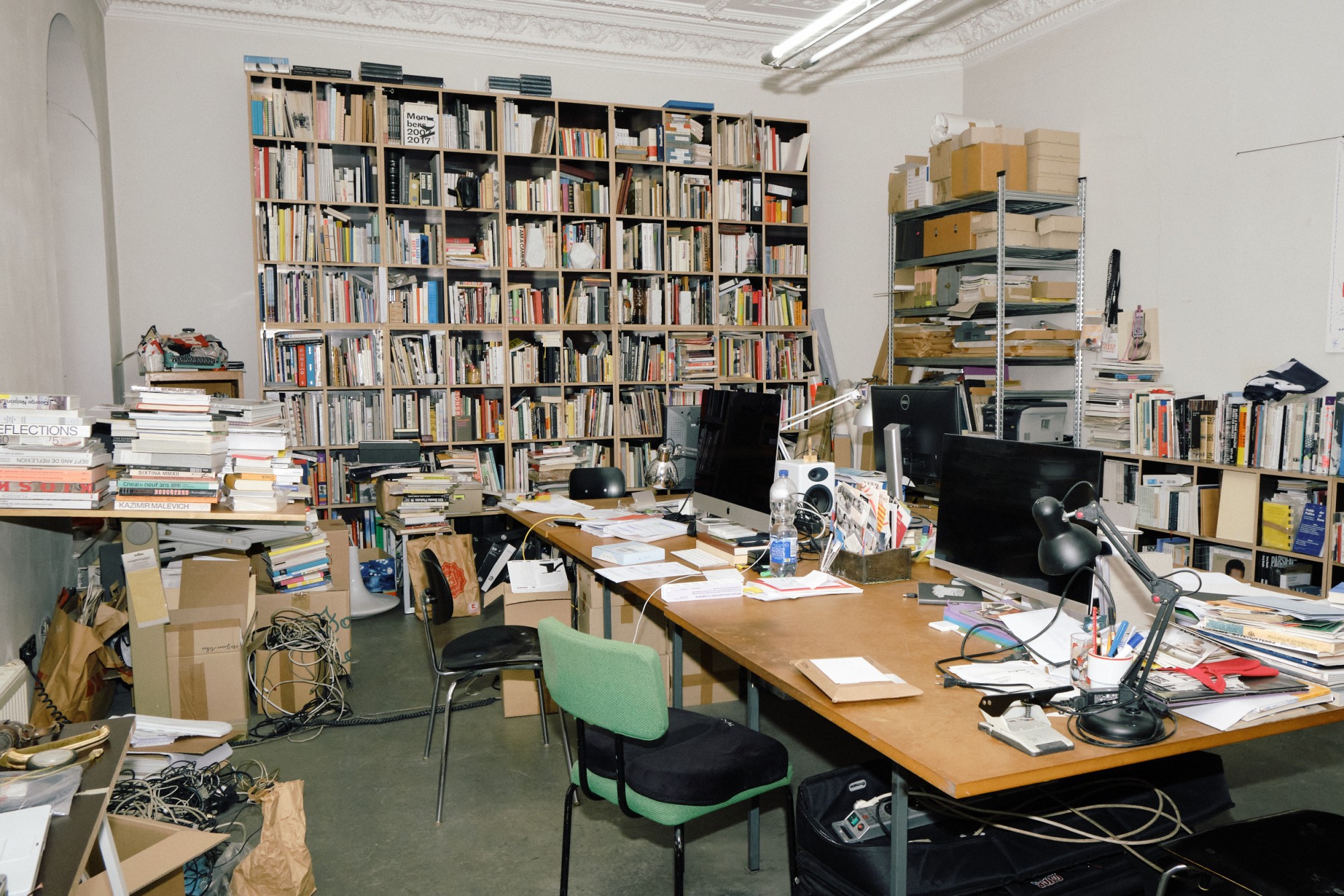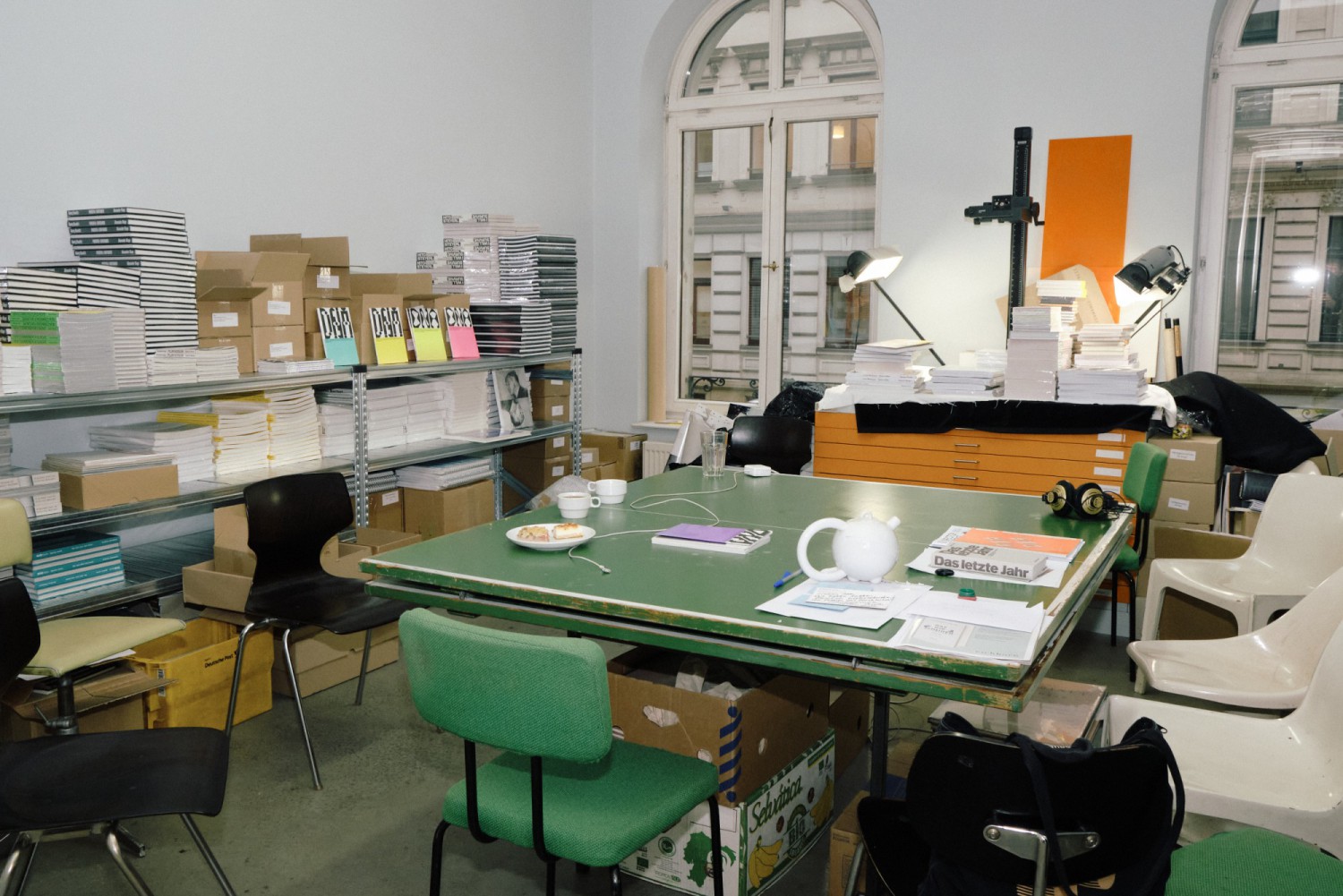 Das Büro ist das Inventar des Büchermachers. Alles, was für die Produktion von Büchern bedeutsam ist, liegt hier aufbewahrt. Als wir im Spätwinter ins Leipziger bureau spector kommen, ist just die Heizung ausgefallen. Und doch weist dieser Ort seine Homöostase aus. Mühelos errichtete Bücherstapel, die sich in meterhohe Regale drängen, scheinbar gedankenverloren platzierte Notizen und Schnipsel, provisorische und doch seit langem genutzte Aufbauten für die Belichtung und Fotografie der laufenden und abgeschlossenen Arbeit, sterilisierendes Neonlicht, das von den hohen Gründerzeitdecken auf eine große blattgrün splitternde Fläche fällt, die mehr an eine ausrangierte Tischtennisplatte als an einen Schreibtisch erinnert und uns mit ihren langen Kanten unsere Plätze zuweist. Das also ist die stille Szenerie eben jener sagenhaften Arbeit, die Spector Books herstellt.