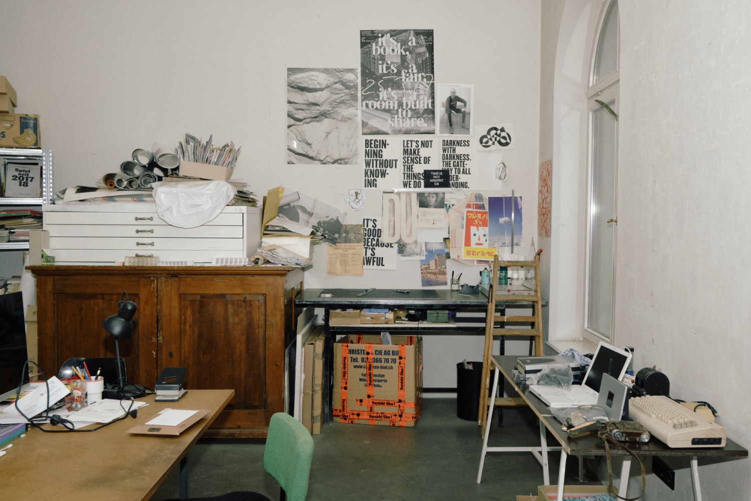Teilweise. Anfangs hatten wir gemerkt, dass für uns allein die 150 Quadratmeter einfach viel zu groß sind. Wir haben als GbR begonnen, zu dritt, und es gab befreundete Gestalterinnen und Gestalter. Leute, die einfach auch einen Büroplatz suchten, und so war das in der Anfangszeit eine gute Kombination. Auch weil das eine gewisse Geselligkeit mit sich brachte. Man sitzt nicht alleine an seinem Schreibtisch und starrt auf sein Dokument auf dem Bildschirm, sondern kann auch andere mal draufschauen lassen. Oft haben die Gestalter dann auch Projekte mit uns gemacht. Fabian Bremer zum Beispiel hat seinen Tisch hier, mit ihm zusammen haben wir inzwischen viele Bücher gemacht.