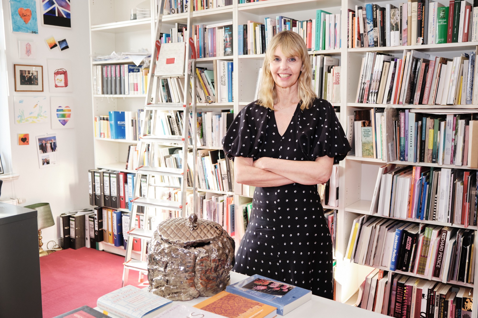 Mein Zuhause ist also eine gelegentlich durch Lärm bedrohte Produktionsstätte, in der ich während der Pandemie viel Zeit verbracht habe. Hier lebe ich auch mit meiner Patchworkfamilie – in dieser Küche, in der wir jetzt sitzen, kommen wir zum Essen und Diskutieren zusammen. Vor der Pandemie haben hier auch zahlreiche Treffen mit Freund:innen stattgefunden. Mit der Pandemie ist es ein Ort geworden, der sich sehr auf die Kernfamilie beschränkt hat. Pandemiebedingt wurde mein Arbeitszimmer auch zu einem Ort der Lehre. Von hier aus habe ich meine Online-Veranstaltungen und Zoomvorträge gehalten. Auch sportliche Betätigungen fanden im Arbeitszimmer statt – die Online-Barre- und Yogakurse, die ich mache.