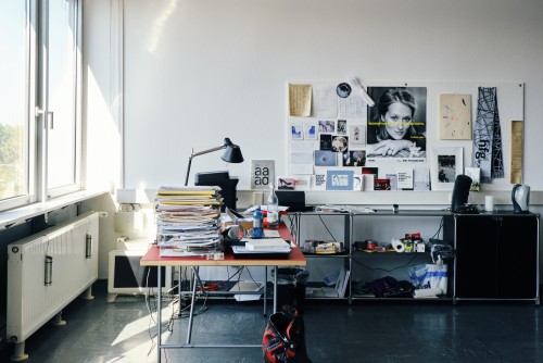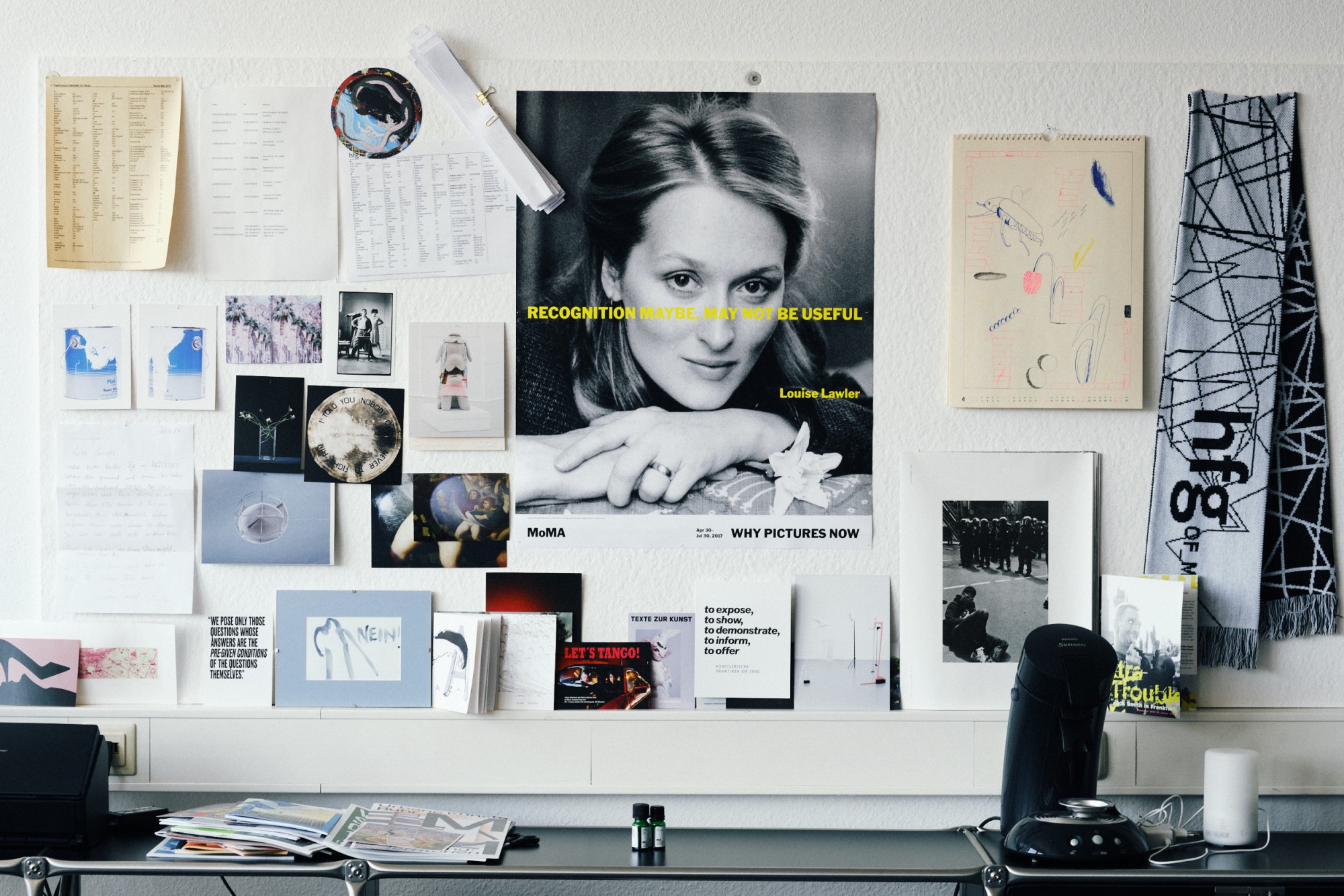 Als wir eintreten, lächelt uns Juliane Rebentisch lange an. Gläser und eine Glaswasserflasche, die wir im Laufe des Gesprächs zweimal ersetzen werden, stehen auf einem großen Tisch in der Mitte des Raumes. Papier und Stift liegen, wo sie uns gleich gegenübersitzen wird. Sie wird sich später Notizen gemacht haben. Rechts von dort, wo wir gleich sitzen werden, eine Pinnwand mit Reminiszenzen. Ein Plakat zeigt den Satz von Louise Lawler: »recognition maybe, may not be useful«. Daneben hängt ein schwarzweißer Fanschal der HfG Offenbach. Eine Zeichnung von Monika Rinck sagt blassblau »Nein!«. Auf dem Regal Kaffeemaschine und Wasserkocher, in den unteren Fächern Tee, Küchenrollen und Sonstiges. Auf dem Schreibtisch stapeln sich Akten. Ein älteres MacBook steht noch aufgeklappt.